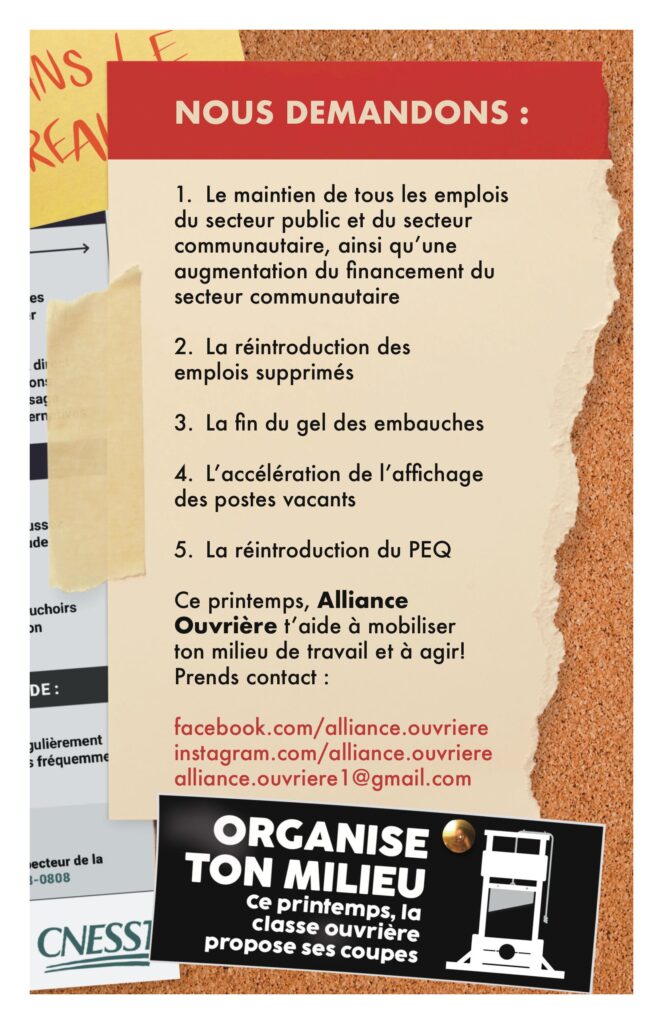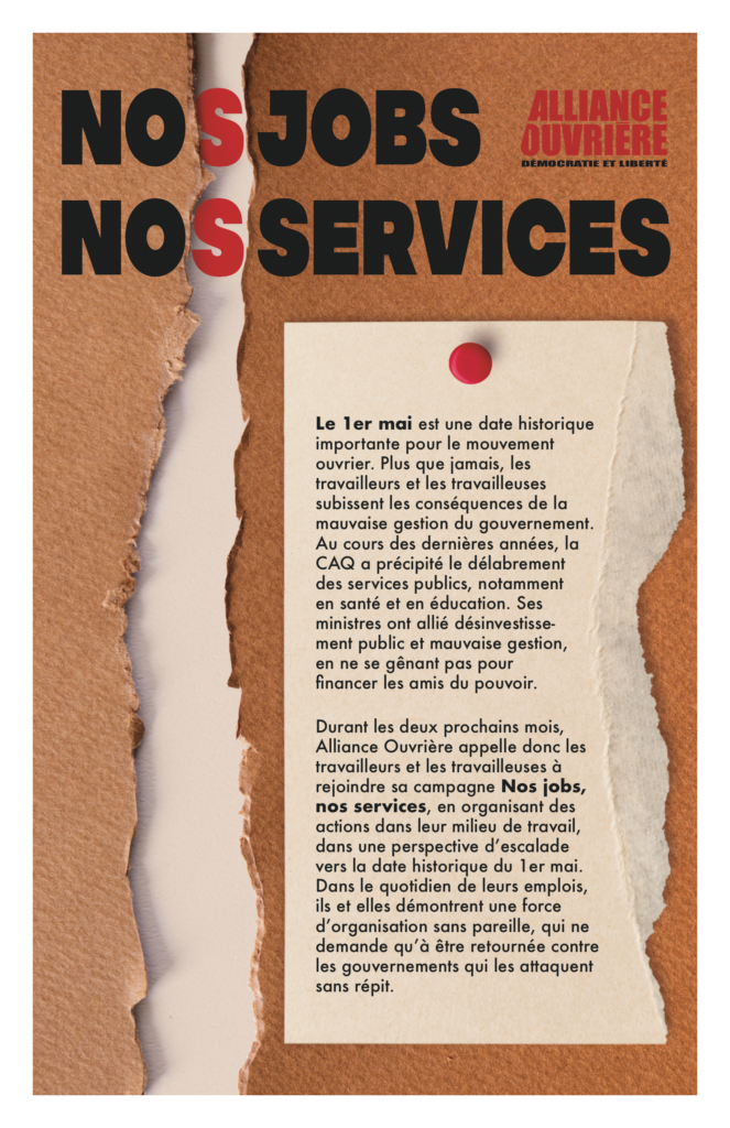 Le 2 mars 2026, le chapitre montréalais d’Alliance Ouvrière a lancé sa campagne printanière No(s) Jobs, No(s) Services contre les coupures d’emplois et le désinvestissement dans les services publics.